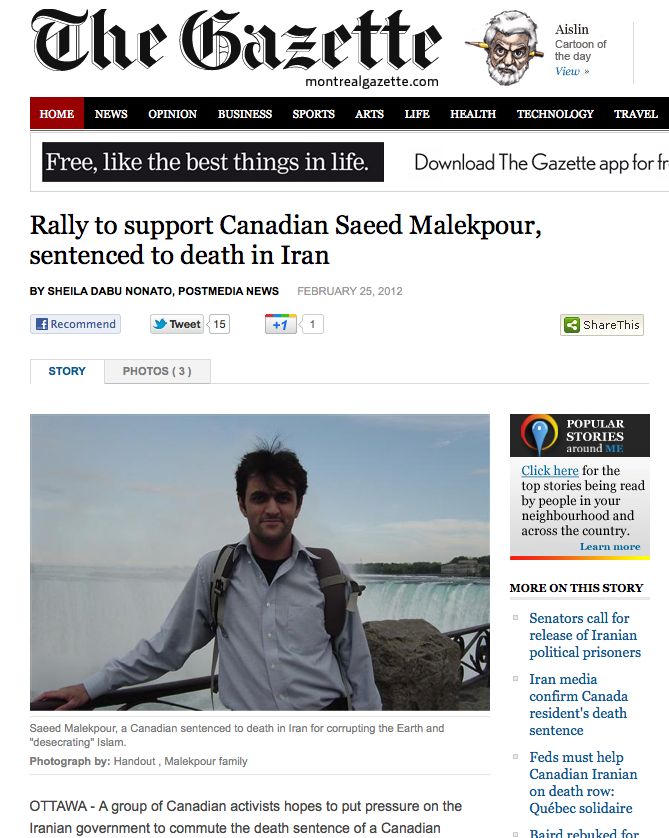 Rally to Support Canadian Saeed Malekpour, Sentenced to Death in Iran | Montreal Gazette | Feb 25 2012
