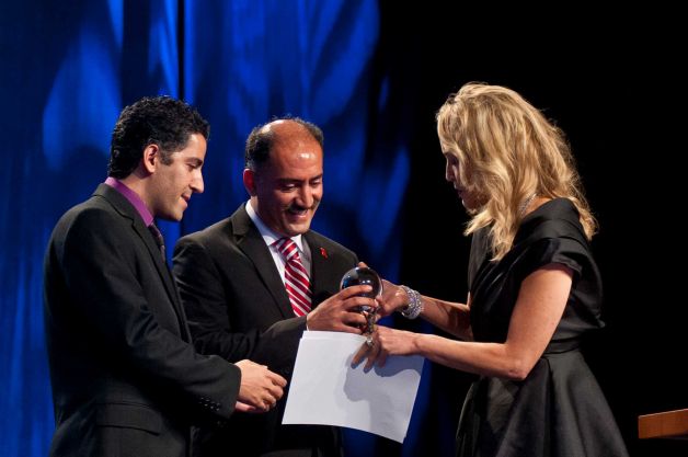 Drs Kamiar and Arash Alaei receive inaugural Elizabeth Taylor Human Rights Award from Sharon Stone on July 22, the opening day of the AIDS 2012 – XIX International AIDS Conference in Washington, DC. (Kris Connor/Getty Images)